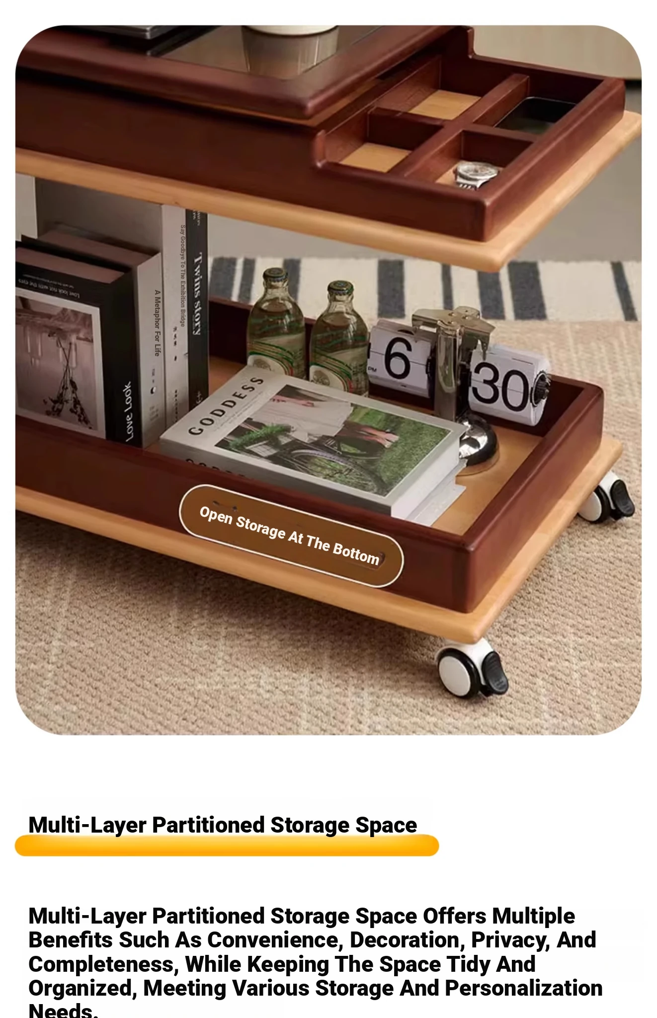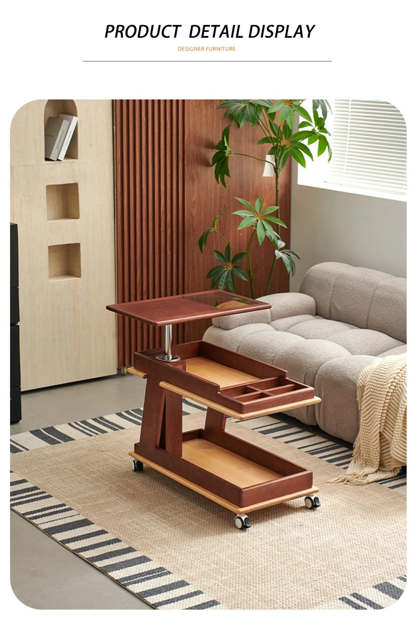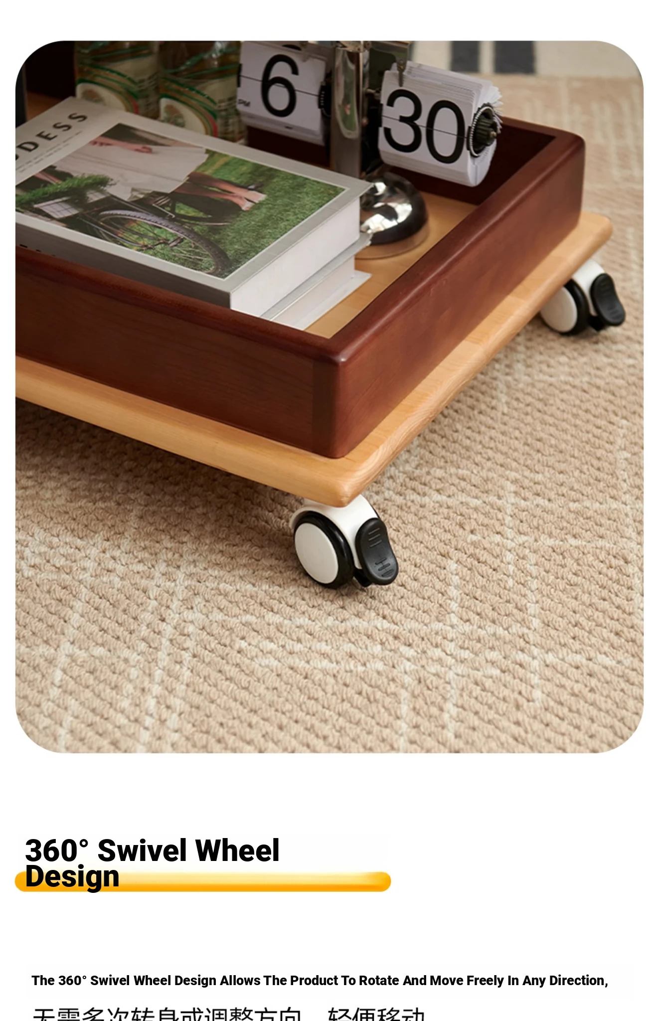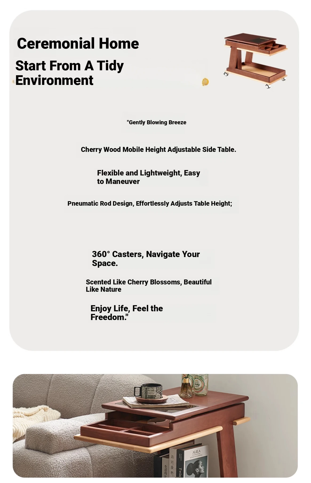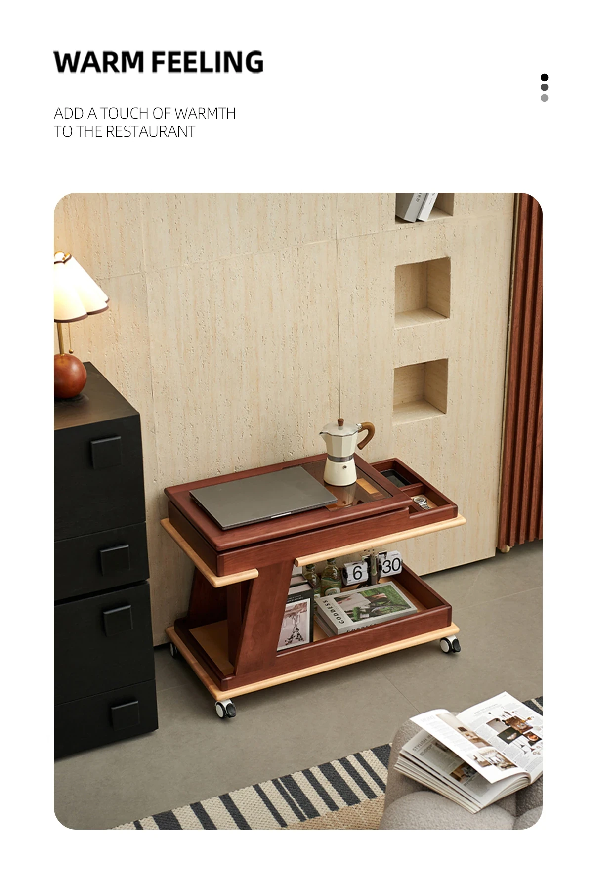 Aisenlante Solid Wood Rolling End Table - Vintage Home Living Room Sofa Storage Rack with Lift Mechanism - Versatile Nightstand on Wheels for Easy Mobility and Style