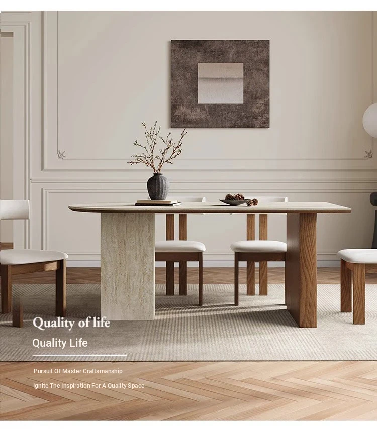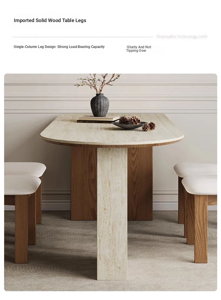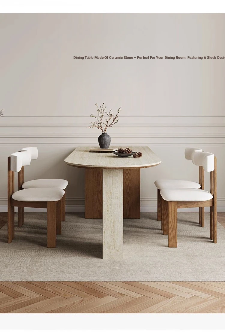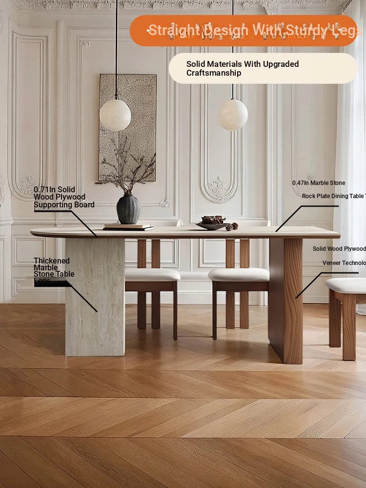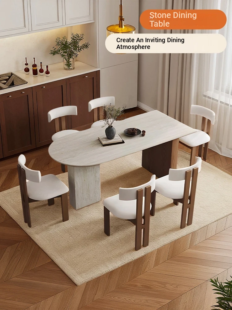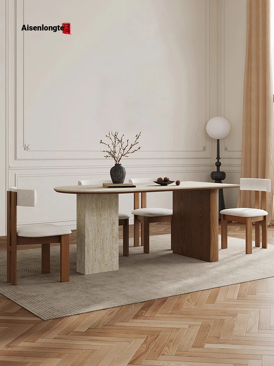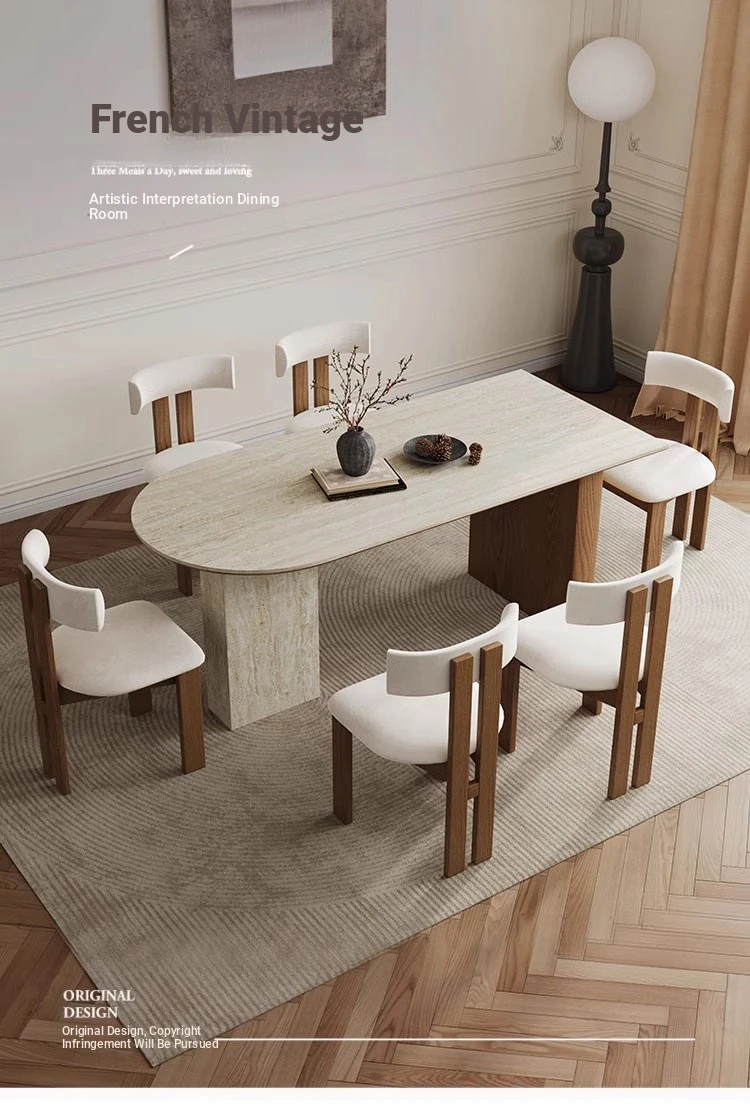 フランス風ヴィンテージの岩板ダイニングテーブル&チェアセット - 小さなスペースにぴったりなデザイナーズ中古侘寂スタイルの無垢材と洞石の食卓で、洗練された食事空間を演出!