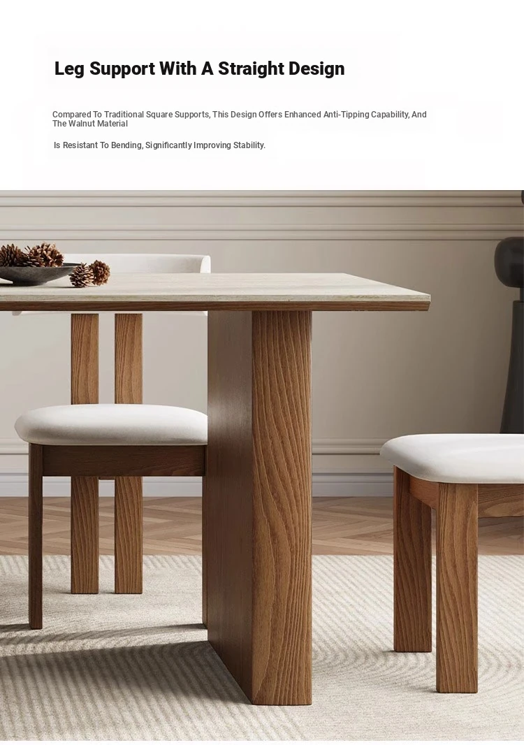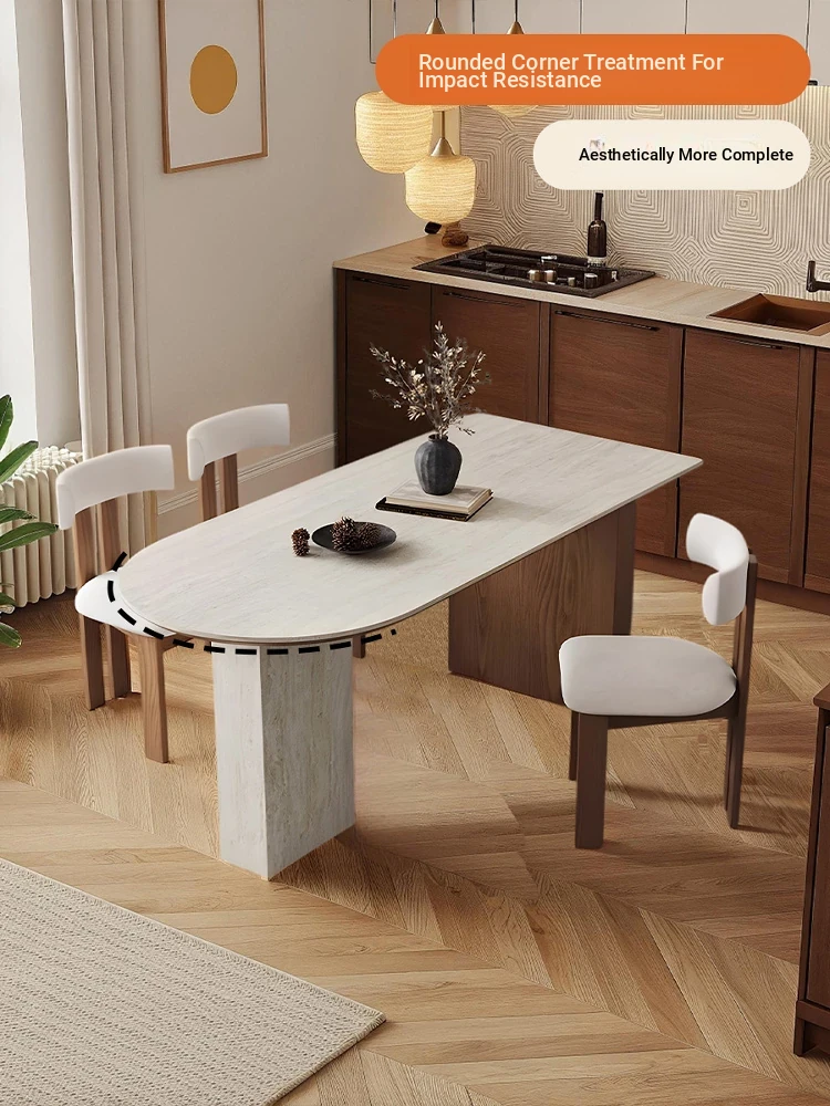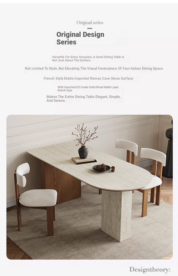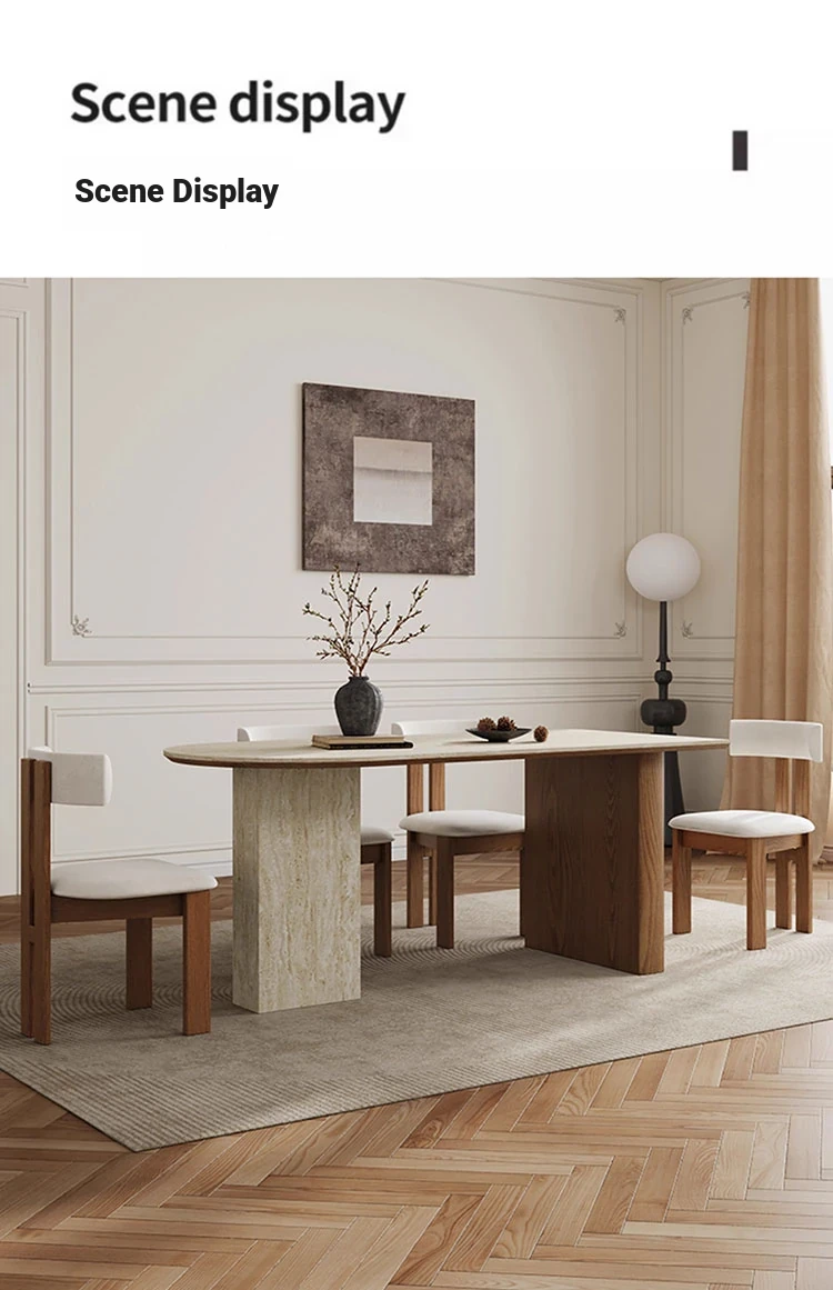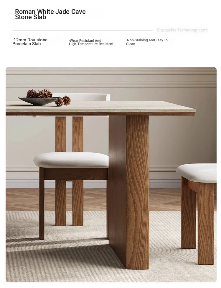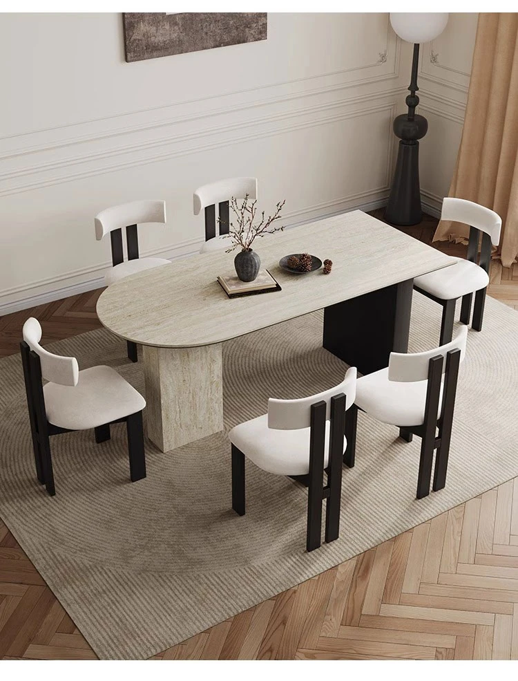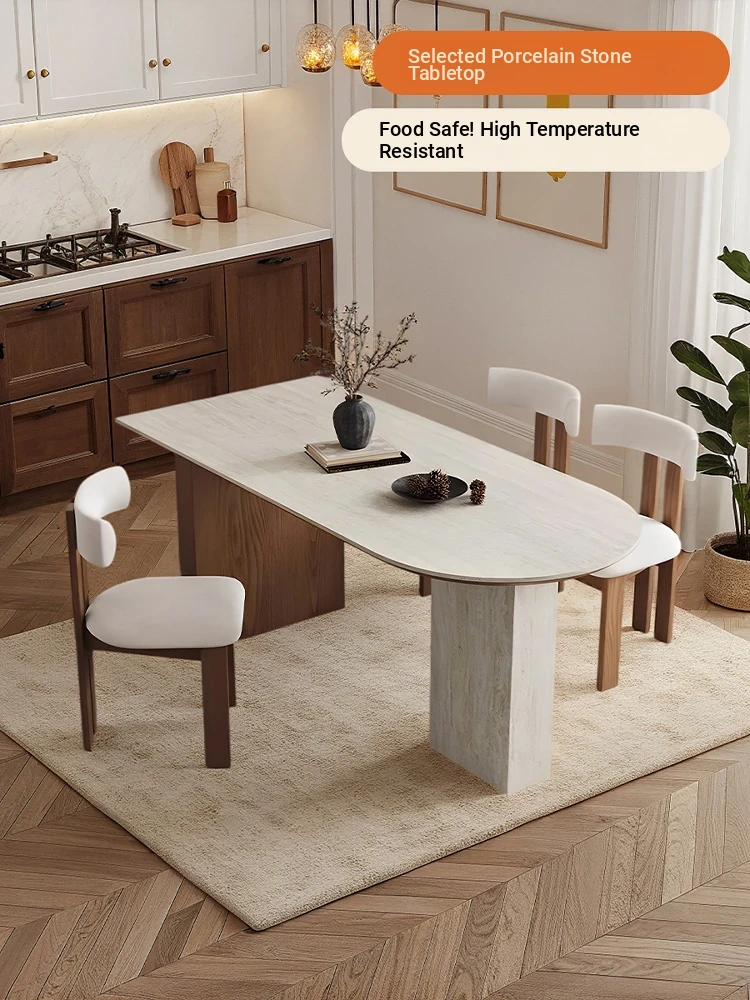 フランス風ヴィンテージの岩板ダイニングテーブル&チェアセット - 小さなスペースにぴったりなデザイナーズ中古侘寂スタイルの無垢材と洞石の食卓で、洗練された食事空間を演出!